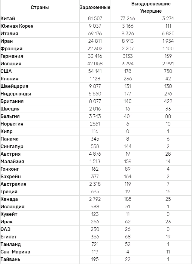 Общий подсчет мировой статистики коронавируса на сегодня составляет 424 054 зараженных, 105 802 выздоровевших и 18971 умерших. Из данных подсчета всемирной организации здравоохранения, за 1 день было выявлено +45 375 новых случаев заболевания, +4 817 выздоровления и 2 463 смертей. В Турции зафиксировали резкий скачок в статистике заражения за 24 марта. Профессор Австрийского института Майкл Танчум сообщил, что в турецком государстве коронавирус распространяется быстрее, чем в Италии. Количество заболевших уже составляет 1892, ежедневно увеличиваясь в среднем на 400 человек. Правительство страны отправило полицию патрулировать улицы. Кроме того, власти Турции планируют распустить всех заключенных. В стране было задержано более 60 людей за дезинформацию в социальных сетях, а также за побег с карантина. Новости произошедшие в мире за последний день: Таблица статистики коронавируса в мире на 25 марта 2020 года Внимание! Таблица статистики коронавируса в мире составлена и обновлена на