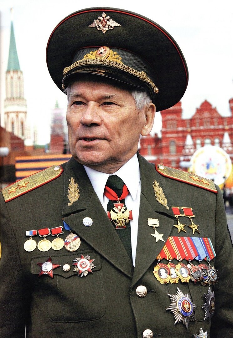 Михаи́л Тимофе́евич Кала́шников (10 ноября 1919, Курья, Алтайская губерния — 23 декабря 2013, Ижевск, Россия)[5][6] — российский и советский конструктор стрелкового оружия. Доктор технических наук (1971), генерал-лейтенант (1999), создатель всемирно известного автомата Калашникова (АК). Герой Российской Федерации (2009). Дважды Герой Социалистического Труда (1958, 1976). Лауреат Сталинской премии l степени (1949), Ленинской премии (1964) и Государственной премии Российской Федерации (1997). Кавалер трёх Орденов Ленина (1958, 1969, 1976) и Ордена Святого апостола Андрея Первозванного (1998)[7]. Член Союза писателей и Союза дизайнеров России. Депутат Совета Союза Верховного Совета СССР 3—4 (1950—1958) и 7—11 (1966—1989) созывов.
