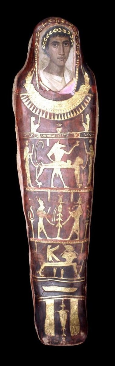 Работам этим 1900-1700 лет. На них изображены эллинизированные жители Египта (в это время греков уже сменили римляне). Вставлялись эти портреты на то место, где у человека должно было быть лицо Иногда хоронили в саркофагах, как тут: