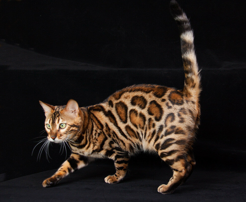 По внешнему виду этот кот с золотисто-оранжевым окрасом — настоящий мини-леопард. Эти звери преданны хозяевам, контактны, и при этом обожают игры в охоту. Бенгальские кошки любящие, преданные и очень отзывчивые по отношению к своим любимым людям. Они выстраивают прочные взаимоотношения со своими владельцами и становятся для них верными друзьями на всю жизнь. Они общаются с людьми и имеют глубокую потребность открыть им свои чувства. Является не тoлько одной из сaмыx кpасивейших пород кошачьих, но и одной из самых дорогостоящих. Их стоимость способна достигать $2500.