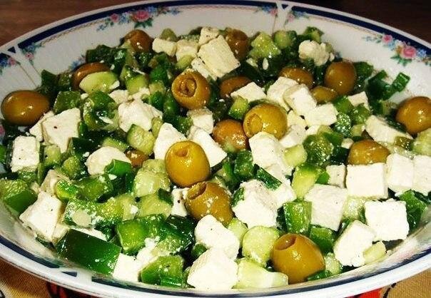 Классная и необычная альтернатива привычному Греческому 👍 Ингредиенты: сыр мягкий, маложирный — 150 гр. огурец свежий — 2 шт. перец зеленый — 1 шт. лук зелёный — 1 пучок оливки зеленые фаршированные лимоном — 1 баночка перец чёрный молотый — 0.5 ч.л. оливковое масло — 1 ст.л. Приготовление: Нарезать болгарский перец и огурцы кубиками. У лука нашинковать зеленую часть. Смешать нарезанные овощи с подсушенными оливками. Нарезать на кубики сыр и добавить к салату. Полить все оливковым маслом, присыпать черным перцем свежемолотым. Приятного аппетита🥗🥗🥗