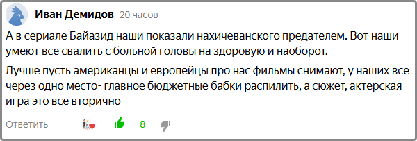 Причем этот кто-то, должен быть достаточно высокого ранга, чтобы заказать соответствующий фильм, и сценарий к нему, продвинуть армянских актеров (главное, на те роли, где надо от души сыграть отвратительные образы) и показать все это по государственному каналу в прайм-тайм.
