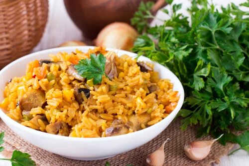 Плов с грибами и овощами очень прост в приготовлении, к тому же блюдо получается вкусным и очень ароматным. Набор овощей можно регулировать по вкусу или по сезону, сюда отлично подойдет и болгарский перец, и стручковая фасоль, капуста брокколи, и т.д. Как приготовить плов с грибами и овощами Ингредиенты: Приготовление: В толстостенной кастрюле или казане разогреть 2 столовые ложки растительного масла. - Добавить нарезанные средними кусочками шампиньоны и обжарить их до румяной корочки. На это уйдет примерно 10-12 минут. - Добавить нарезанную мелким кубиком репчатую луковицу и нарезанную соломкой морковь. Перемешать и обжарить 3-4 минуты. - Добавить горошек, кукурузу (можно использовать замороженные овощи), специи для плова, соль и перец по вкусу, промытый рис (я использовала длиннозернистый), влить кипяток, перемешать, накрыть крышкой и тушить 10-15 минут. - Открыть крышку, воткнуть в середину блюда целую неочищенную головку чеснока, накрыть крышкой и продолжить тушить еще 10-15 минут