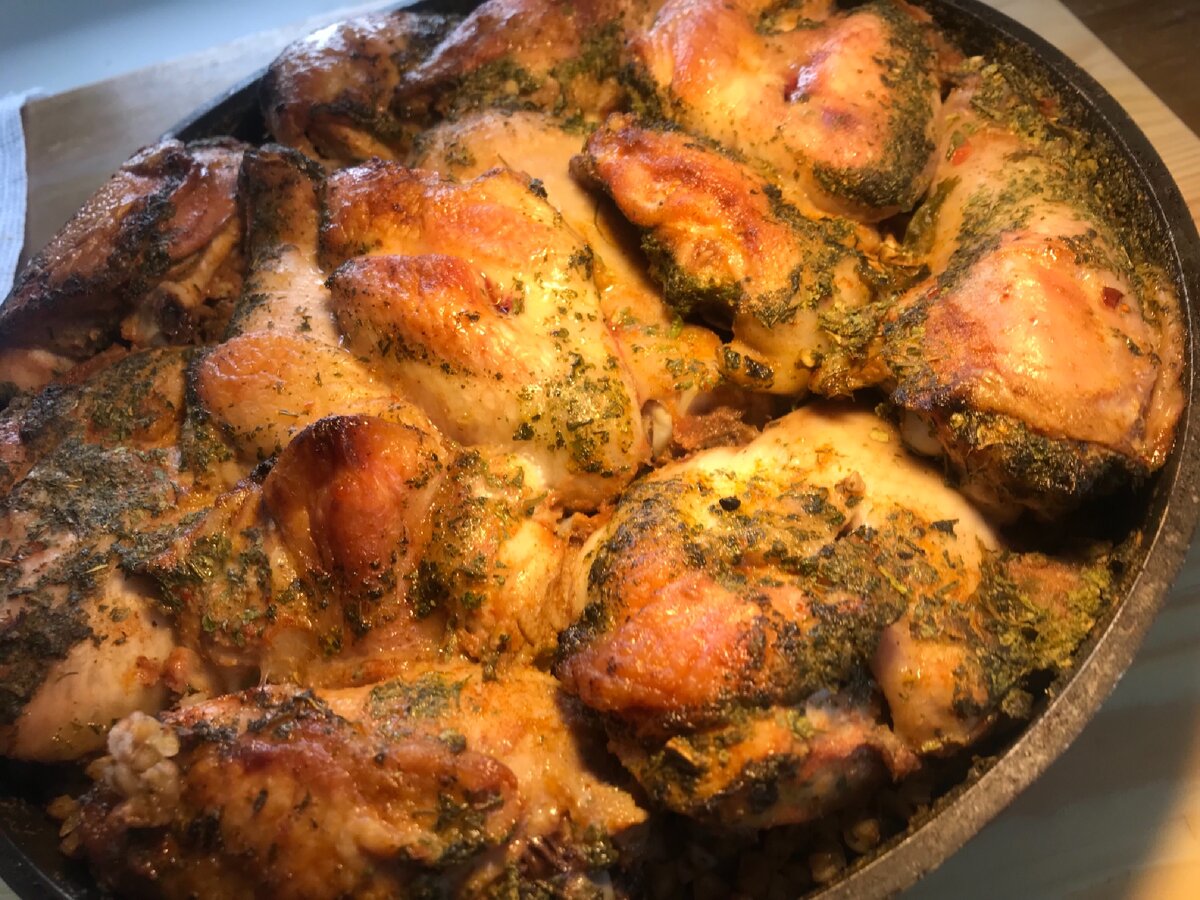 Представляю вашему вниманию самый быстрый способ приготовления основного блюда с гарниром, без заморочек! Подпишись и Не пропусти самое интересное и имей возможность почитать в любое время😉 Нам понадобятся: 1.Курица охлажденная-1шт 2.Гречка-2 стакана 3.Том.паста-2 Ст.л 4.Чеснок-3 зубчика 5.Специи для курицы по вкусу( в моем варианте копченая паприка, сухой чеснок, хмели-сунели) 6.Сушенная петрушка 7.Вода-4 стакана 8.Соль по вкусу Начнем: 1)Перед тем как разделывать курицу, предлагаю сначала заняться гречкой, берём глубокую форму для запекания(это может быть скорода или спец.форма), берём гречку солим добавляем петрушку, засыпаем гречку в форму и заливаем водой, пусть стоит пока ждёт когда положим на неё курицу! 2)Разделываем курицу, смешиваем все специи, соль и чеснок(Предварительно проведён через чеснокодавилку), натираем обильно курицу этой смесью и выкладываем на гречку, чтобы курица полностью покрывала нашу гречку 3)Ставим в предварительно разогретую духовку до 200 градусов,