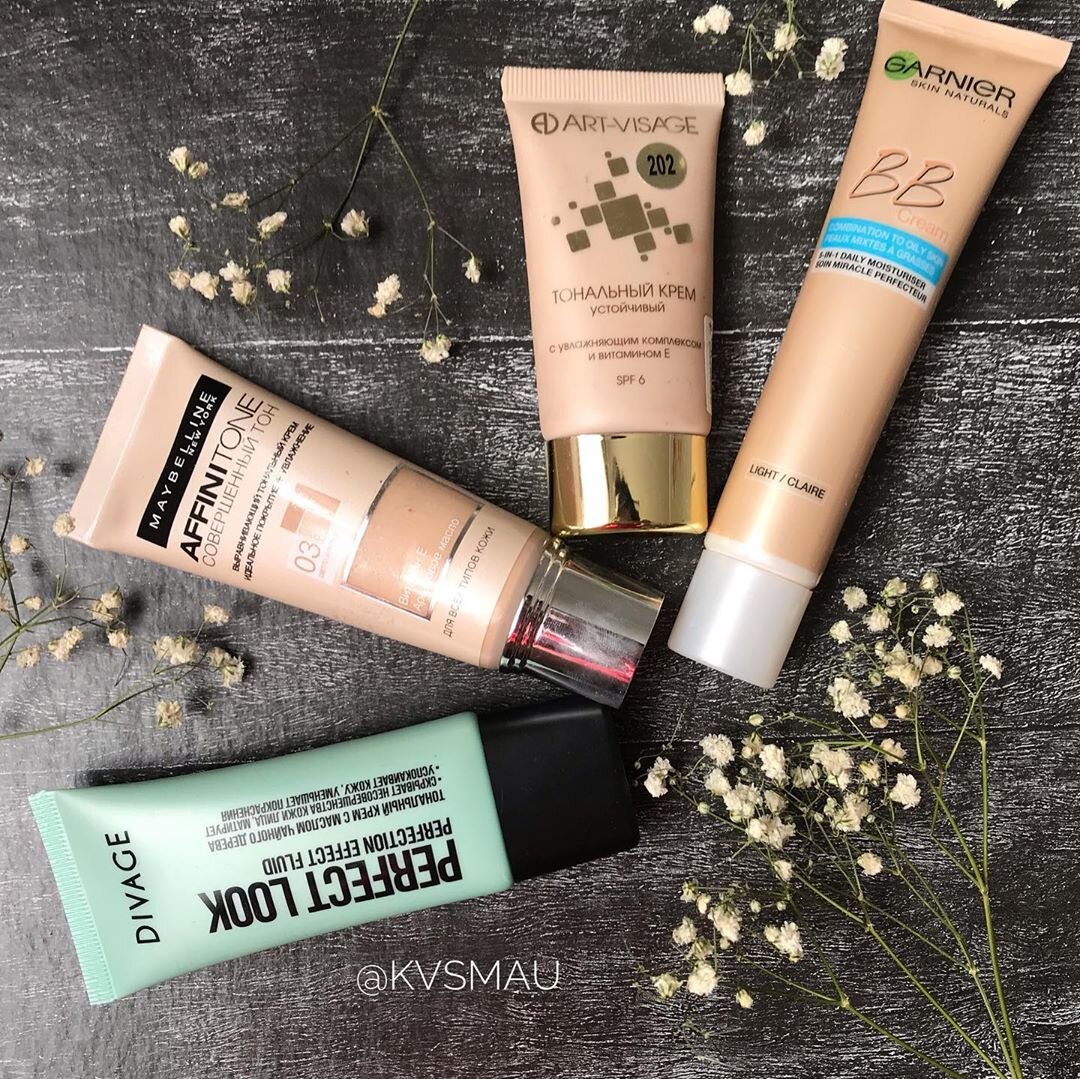 Думаю, ни для кого не секрет, что сейчас среди бюджетной косметики можно найти настоящие жемчужины. Сегодня представляю Вам отличников и хорошистов среди тональных кремов сегмента массмаркета. . Все тестировала на себе, напомню, что я обладатель комбинированной, склонной к жирности кожи. . DIVAGE Perfect Look (тон 1): консистенция плотная, лучше наносить спонжем, средней плотности покрытия, но с хорошим перекрывающим эффектом. В составе есть масло чайного дерева, что благотворно для проблемной кожи. Финиш полуматовый, держится хорошо. Оттенок с оранжеватым подтоном, но адаптируется под кожу, подойдет загорелой коже, белоснежкам не рекомендую. Оценка 4 (из-за сложного цвета). Цена на Wildberries 250 р. . MAYBELLINE Affinitone (тон 3): консистенция средняя, однородная, с вкраплениями мелкого шимера, наносить лучше спонжем, покрытие плотное, перекрывающая способность превосходная, но может подчеркивать шелушения. Финиш матовый, держится весь день. Оттенок 3 – светло-бежевый, очень адапти