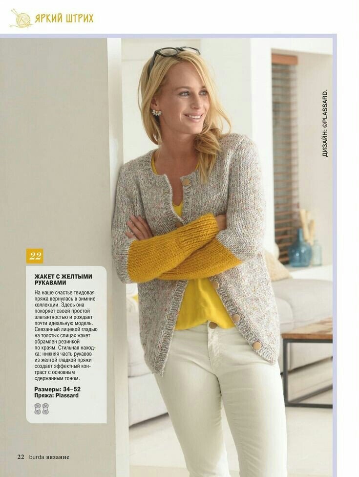 Вам потребуется: пряжа Plassard "Sotweed" (72% акрила, 20% овечьей шерсти, 5% шерсти альпака, 3% вискозы; 50м/50г) - 11 (11) 12 (13) 15 мотков серой меланжевой (№270); пряжа Plassard "Trappeur" (50% акрила, 25% овечьей шерсти, 25% шерсти альпака; 75м/50г) - 2 (2) 2 (3) 3 мотка жёлтой (№47); спицы №6 и 7; 6 пуговиц диаметром 22мм.