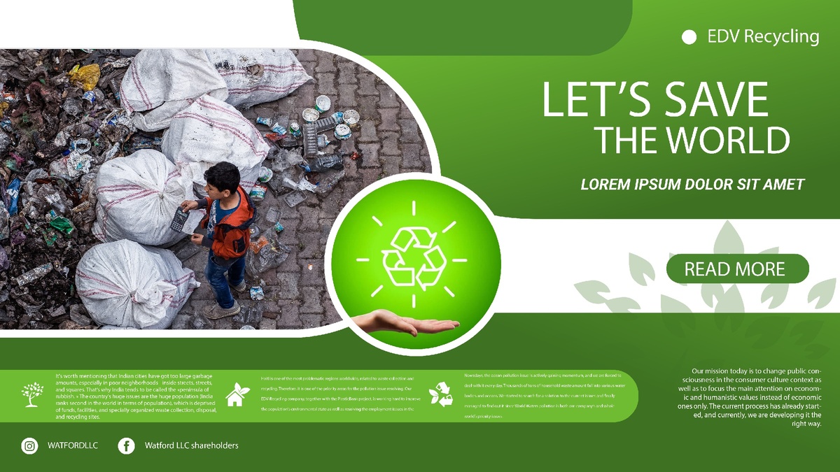 Currently, the environmental pollution issue is an important part of our objective reality; therefore, our company’s goal is to fight the current reality to make our world a better place. The excess garbage and waste issue are especially important in remote regions, in which the population has crossed the poverty line; therefore, our EDV-Recycling company’s goal is to improve the environmental state as well as provide a better life quality for the poor people.