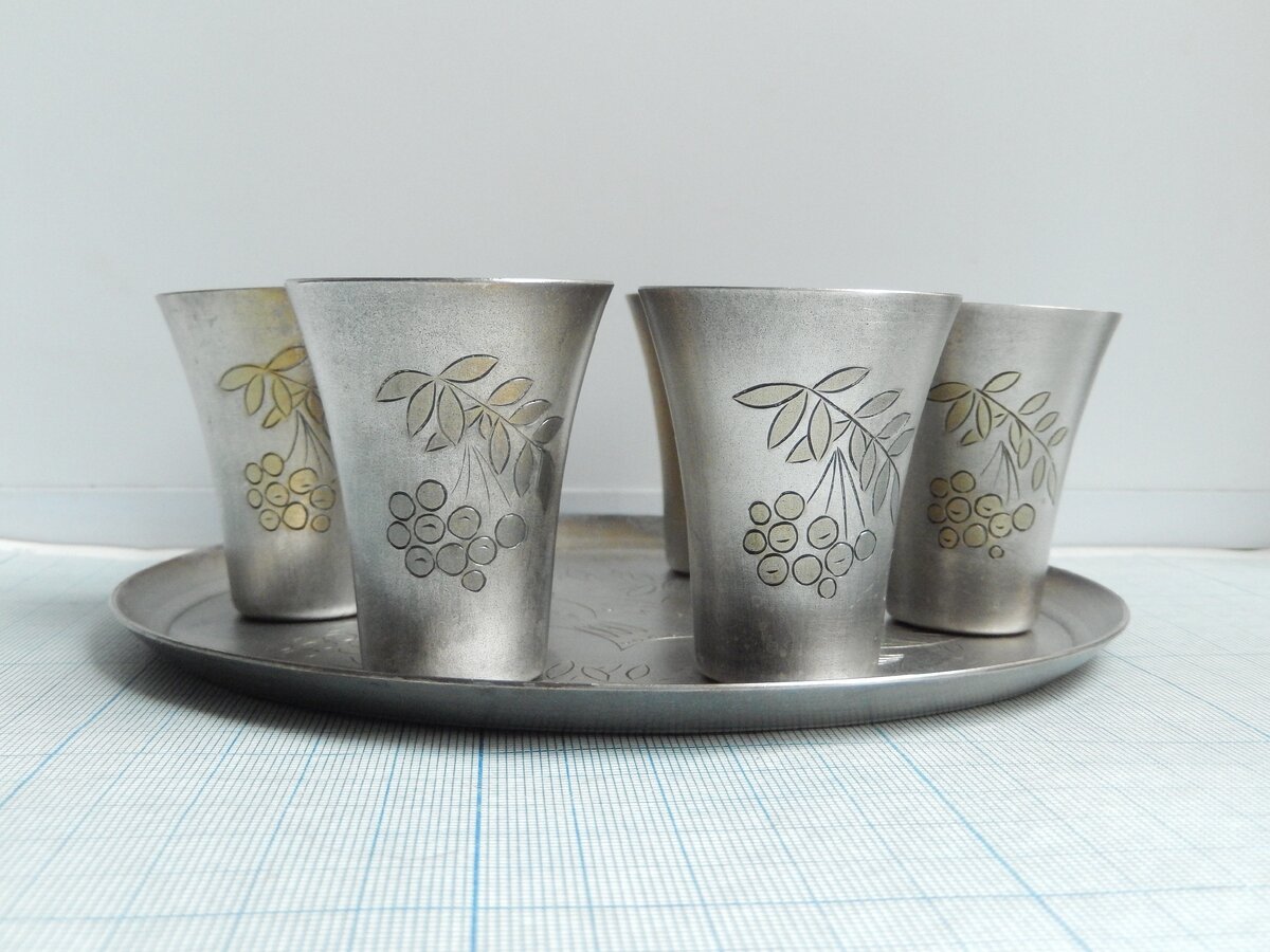 На каждом предмете есть клейма, правда они плохо пропечатаны. Но на одной из стопок явно видно «2ЮММЕТ». А это значит, что набор изготовлен в 1972 году. А теперь посмотрим на цену, указанную на подносе. Целых 98 руб. 50 коп!!! Это же обалдеть надо!!! В то время средняя зарплата (не начальствующего состава) была около 120 руб. И каково было за такой набор отдать практически весь месячный заработок!!! Не знаю, кто мог себе это позволить. А главное не понятно зачем. Ведь это даже не серебро!!!