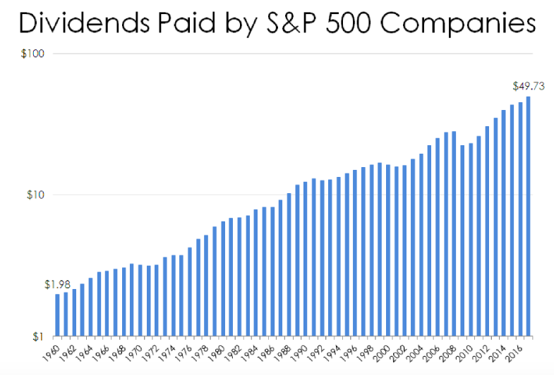 Совокупный ежегодный рост дивидендов компаний из индекса, в среднем на 3% опережает инфляцию. За последние 60 лет. И это без учета роста котировок.