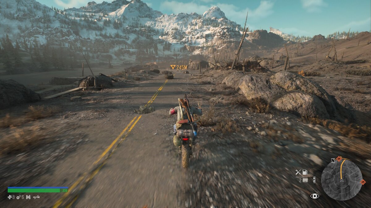 Езда на мотоцикле сделана хорошо. Байк отлично управляется, его можно улучшать, повышая характеристики, добавлять закись азота и кастомизировать внешний вид. Первые часы игры поездки очень развлекают, хочется колесить по карте и исследовать. К сожалению, есть сюжетные ограничения, и исследовать всё вам не дадут. Да и начальная экипировка не позволит легко справится с ордами фрикеров (так в игре называют зомби). Несомненно, за те десятки часов, которые требует прохождение игры, игроку вполне может надоесть езда по довольно пустынному миру, поэтому в часть точек можно попасть благодаря быстрому перемещению, которое моментально потребляет топливо из бензобака мотоцикла, а если его недостаточно - то перемещение будет недоступно. На начальных этапах игры топливо может стать проблемой, но после улучшения бензобака топлива хватит, чтобы пересечь чуть ли не всю карту из одного конца в другой.