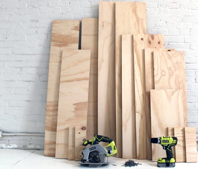 Мы использовали то что было - фанеру. Вся консоль сделана из полос фанеры, которые сложены вместе. Это очень простой способ создания шкафчика для тв и декорирования помещения. Разрезая и расставляя различные фанерные полосы ну или доски ( в зависимости что будете использовать), вы можете сделать серию полочек консолей для своих нужд так как Вам нравится.