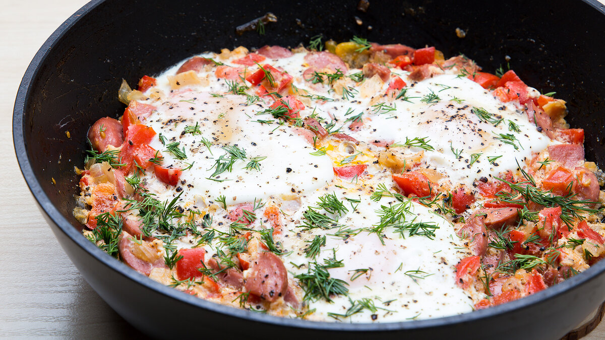 Вкусный, сытный завтрак для всей семьи, готовится очень быстро и просто, хорошая альтернатива привычным бутербродам. Нам понадобится: Яйца - 3 шт. Помидоры - 1-2 шт. Перец - 1-2 шт. Колбаса - 80 гр Лук - 1 шт. Соль по вкусу Перец по вкусу Масло для обжарки Способ приготовления: 1. Нарезаем болгарский перец небольшими кубиками 2. Мелко нарезаем лук 3. Помидоры нарезаем кубиком 4. Обжариваем лук до золотистого цвета 5. Добавляем нарезанную колбасу или сосиски, обжариваем еще 2-3 минуты 6. Добавляем нарезанные перец и помидоры. Все посолить и поперчить 7. Делаем в обжаренной смеси круги небольшого размера и аккуратно разбиваем туда яйца не повредив желток. Накрываем крышкой, обжариваем на медленном огне до готовности ПРИЯТНОГО АППЕТИТА! Подробный рецепт приготовления можно посмотреть в видео: Еще больше вкусных, простых рецептов на каждый день или на праздничный стол вы найдете на нашем канале в YouTube: https://www.youtube.com/channel/UC7cMai5xAc16foFi75l_7MQ