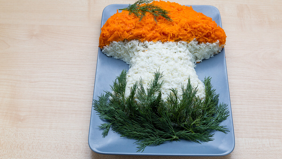 Очень вкусный и простой в приготовлении салат «Осенний гриб», станет украшением любого праздничного стола Нам понадобится: Куриное филе (варёное) - 300 гр Грибы - 400 гр Лук - 1 шт. Яйца - 4 шт. Морковь (вареная) - 1-2 шт. Укроп для украшения Масло для обжарки Соль по вкусу Майонез Способ приготовления: 1. Куриное филе (или грудку) отвариваем до готовности и нарезаем небольшими кубиками 2. Белки отделяем от желтков. Желтки мелко нарезаем 3. Мелко нарезаем лук и грибы. Лук обжариваем до золотистого цвета, добавляем грибы и обжариваем до готовности грибов. 4. Белки натираем на мелкой терке 5. Морковь отварить и также натереть на мелкой терке 6. Смешиваем куриное филе, желтки, обжаренный лук с грибами. Добавляем соль, майонез и перемешиваем 7. На сервировочную тарелку выкладываем салат в виде грибочка 8. Ножку грибочка делаем из белков, а шляпку из морковки 9. Украшаем салат-грибочек зеленью укропа. ПРИЯТНОГО АППЕТИТА! Подробный рецепт приготовления можно посмотреть в видео: Еще