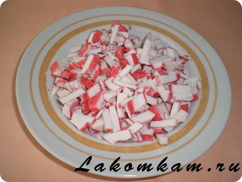 Салат «Крабики». Приготовление. Режем крабовые палочки: