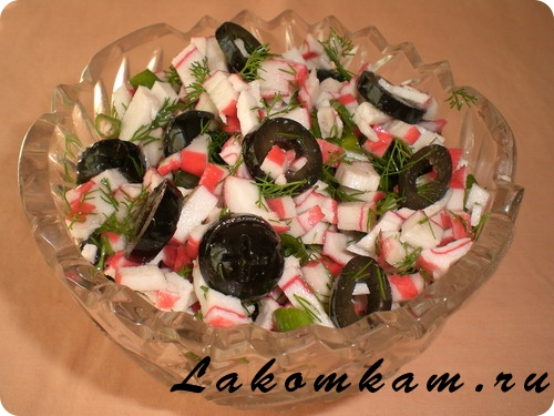 Смешиваем крабовые палочки, маслины, зелень и заправляем подсолнечным маслом:
