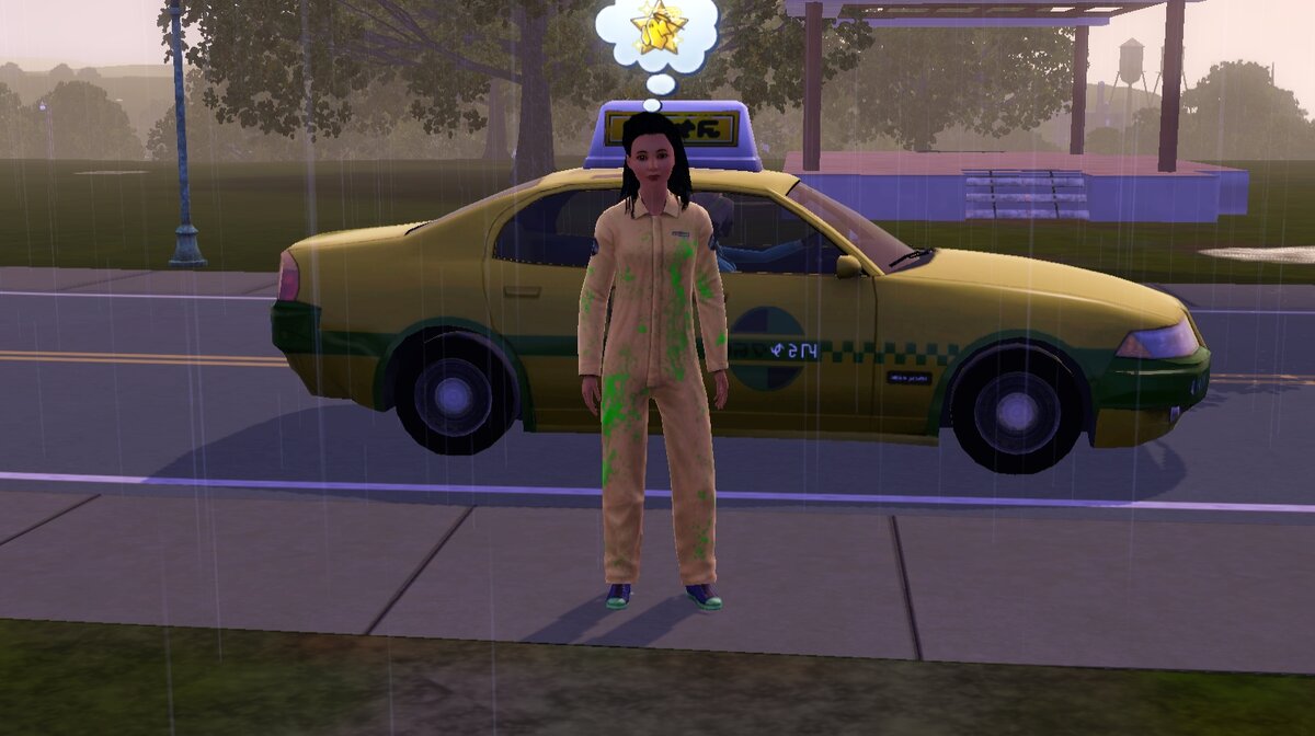 Моя симка устроилась на работу. Ей дали специальный костюм. Как будто испачканный зеленой краской (или кровью призраков! Шучу)