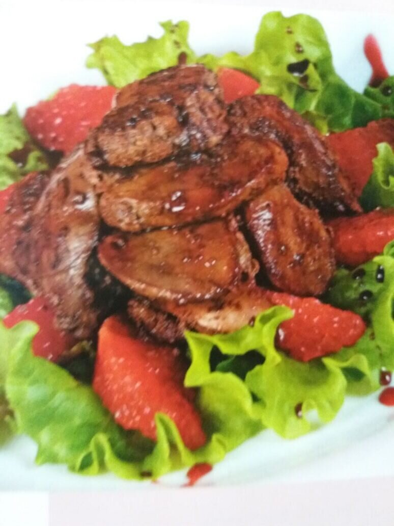 Рецепт из французской кухни. Состав: Приготовление: 1. Куриную печень обжарить на хорошо разогретом оливковом масле по 2 минуты с обеих сторон. Выложить на бумажные полотенца, чтобы избавиться от излишков масла. Хранить готовую печень в тепле. 2. Вино влить в кастрюльку, уваривать на слабом огне до уменьшения в объеме более, чем в двое. Добавить бальзамический уксус, варить еще 5-7 минут. Затем положить мед, размешать и варить 2-3 минуты.Немного остудить. 3. Грейпфрут почистить, разобрать на дольки и удалить перегородки. Мякоть нарезать средними ломтиками. 4. Разложить помытые листья салата на порционные тарелки, выложить на них печень, посолить и поперчить по вкусу. Полить теплым винно-медовым соусом, гарнировать ломтиками грейпфрута и подавать. Приятного аппетита!
