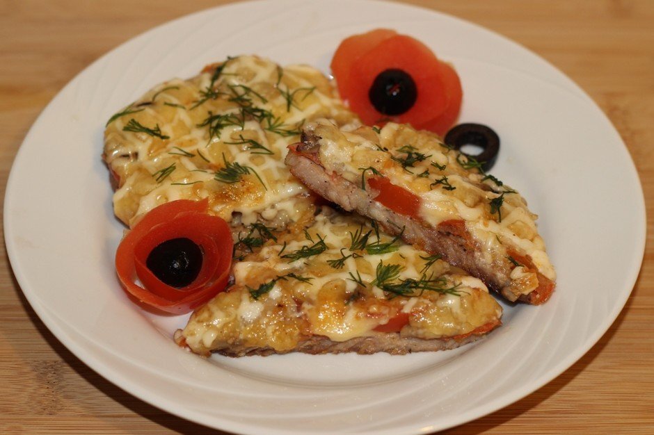 2. Помидоры вымыть, нарезать кружочками и выложить на мясо. По желанию посолить. Сыр натереть на крупной терке и выложить часть (1/3) на помидоры. Грибы почистить, нарезать и выложить на сыр. По желанию посолить.