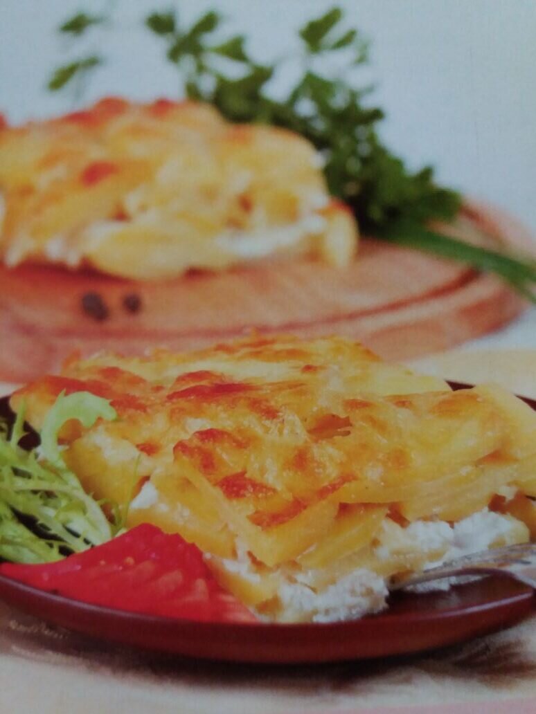 Рецепт из французской кухни! Состав: Приготовление: 1. Картофель очистить, нарезать тонкими кружочками, выложить в глубокую миску, посолить и поперчить. Сыр натереть на крупной терке. Всыпать в миску с картофелем половину сыра, перемешать. 2. Яйцо взбить с молоком и сливками, влить в миску с картофелем и сыром. Чеснок очистить. Глубокую форму для запекания натереть изнутри чесноком, смазать маслом и выложить содержимое миски. 3. Засыпать сверху оставшимся сыром. Равномерно разложить на его поверхности кусочки сливочного масла. 4. Разогреть духовку до 160 градусов и запекать картофель 35 - 40 минут до ровной румяной корочки. Приятного аппетита!