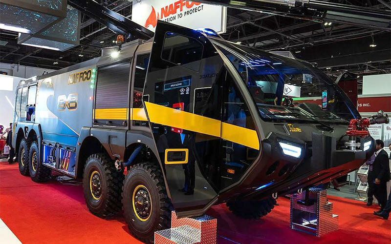 Этот гигант, прозванный NAFFCO Falcon 8 может перевозить 16 000 литров воды и 1920 литров огнезащитной пены. Фирма представила этот автомобиль на прошлой неделе на выставке Intersec 2020. Его приводят в движение два двигателя мощностью около 1400 л.с.