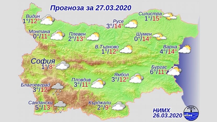 В следующие сутки останется облачно, на местах в Юго-западной Болгарии с дождем. Минимальная температура будет между 0° и 5°, а максимальная – между 9° и 14°... Прогноз погоды в Болгарии на 27 марта