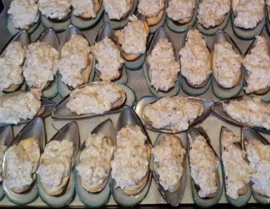 - 5. Разложите ракушки с мидиями на противень. Затем аккуратно сверху положите по чайной ложке соуса в каждую ракушку. Ставьте их максимально ровно, чтоб сок не вытекал на противень. Разогрейте духовку до 220 градусов. Поставьте противень с мидиями в духовку на 15 минут. По истечении этого времени достаньте из духовки. Блюдо готово. Приятного аппетита.
