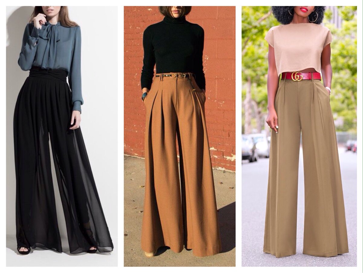 Весной 2020 года одним из главных трендов заявлены брюки палаццо. Они подразумевают использование максимального объема ткани по всей длине штанины. Как известно, облегающие скинни отошли на второй план, тем более что идут они далеко не всем. Да, не каждая из нас обладает длинными, стройными и идеально ровными ногами, а особенности кроя широких брюк скрывают все недостатки. При этом никто не решит, что ваши ноги полнее, чем есть на самом деле, потому что правильные палаццо подчеркивают талию и бедра за счет облегания именно в этой области. Главное не прятать эту изюминку под мешковатым верхом. Но и верх тоже не обязан быть непременно в обтяг - сегодня мода очень вариативна. Что-то объемное сверху можно, к примеру, заправить в брюки. Главное, чтобы это был не толстый свитер объемной вязки. Заправленные блузка или рубашка будут очень уместно смотреться. Или длина объемного верха не должна быть ниже линии, где начинаются брюки. Или можно поиграть в многослойность, где облегающий первый с