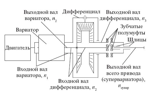 Дисковый вариатор при диапазоне 10 способен выдавать 87-95% КПД, а за счет дифференциала этот показатель еще вырастет. Будь отношение равное 1, все валы вариатора вращались бы с одной скоростью, а коэффициент полезного действия при этом достиг бы отметки 100%. Так как отношение между крутящими моментами валов превышает единицу, его ведомый вал вращается медленнее ведущего, а на ведомый вал супервариатора Гулиа будет вращаться быстрее ведомого вала дискового вариатора и медленнее ведущего вала.