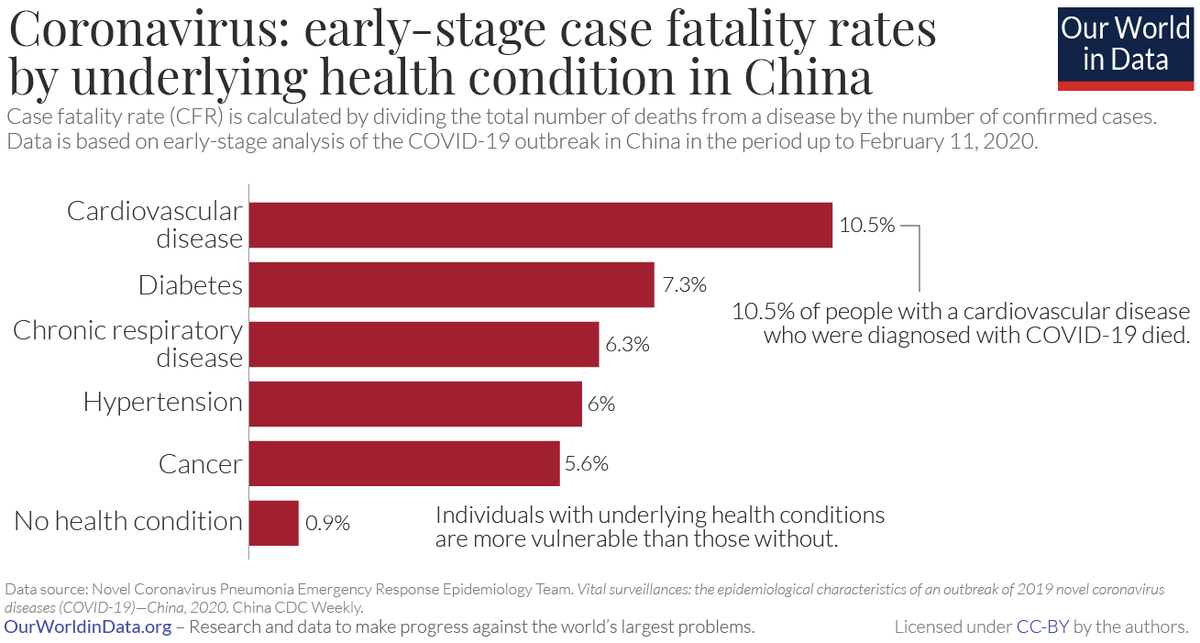 Ранние данные из Китая свидетельствуют о том, что лица с базовыми заболеваниями подвергаются более высокому риску Визуализация здесь показывает коэффициент летальности случаев для населения в Китае на основе их состояния здоровья или основного состояния здоровья. Это основано на тех же данных Центра по контролю и профилактике заболеваний о первоначальной разбивке случаев заболевания, смертности и CFR(коэффициент летальности) среди конкретных демографических групп населения. Этот анализ был основан на зарегистрированных смертях и случаях заболевания в Китае в период до 11 февраля 2020 года. Исследователи обнаружили, что CFR (коэффициент летальности) для тех, у кого есть основное состояние здоровья, намного выше, чем для тех, у кого его нет. Более 10% из тех, кому был поставлен диагноз COVID-19, кто уже имел сердечно-сосудистые заболевания, умерли в результате вируса. Диабет, хронические респираторные заболевания, гипертония и рак также были факторами риска, как мы видим в таблице. CFR