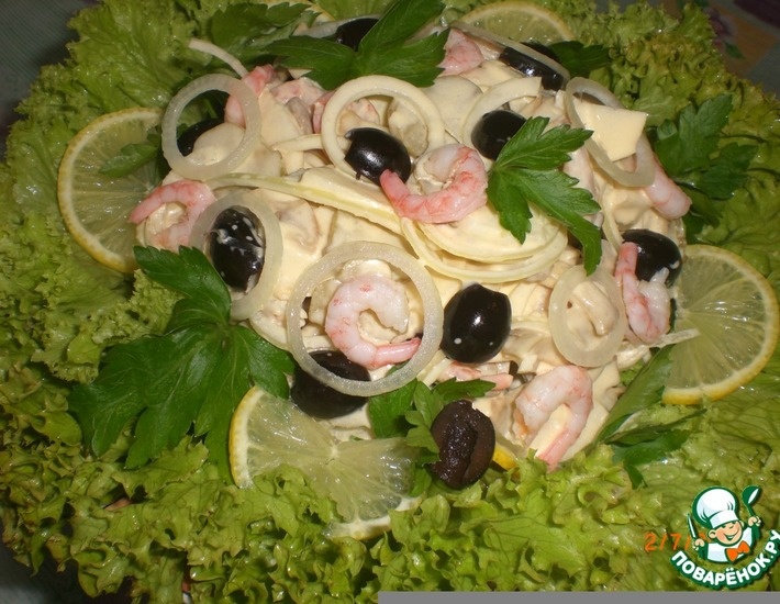 Быстро и вкусно... Салат "Изумительный" Действительно, изумительный салат! Я настолько очарована им, что нет слов! Все его составляющие настолько совершенно дополняют и оттеняют вкус друг друга, просто прелесть! Достаточно лeгкий, очень вкусный, отличный новый салатик к наступающим майским праздником! Ингредиенты для «Салат "Изумительный"»: Пищевая и энергетическая ценность: Готового блюда ккал 1965.9ккал белки92.8 г жиры147.3 г углеводы64.5 г 100 г блюдаккал 110.4 ккал белки5.2 жиры8.3 г углеводы3.6 г Рецепт «Салат "Изумительный"»: Креветки отварить в подсоленной воде с добавлением специй 5-7 мин. Шампиньоны помыть, обсушить и порезать пластиночками. Обжарить грибочки на растительном масле. Дать остыть. Лук порезать тоненькими колечками, если небольшой, то колечками. Огурчики обсушить и нарезать тонкими ломтиками. Остывшие креветки почистить. Яблоки почистить, удалить семенные коробочки и порезать тонкими дольками. Сбрызнуть лимонным соком, чтобы не потемнели. Маслинки р