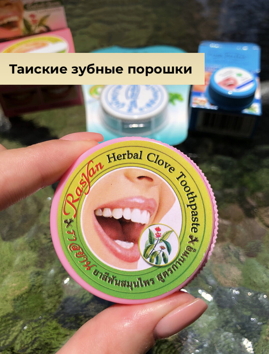 Влажные зубные порошки стали популярны среди гостей страны улыбок В отличии от обычной зубной пасты в тюбике порошок из натуральных трав обладает полирующим эффектом. Приятный травяной вкус и экономичный расход в совокупности с небольшой ценой сделали их хитом продаж в Таиланде. Мы советуем использовать зубной порошок 1-2 раза в неделю. Для ежедневного применения - слишком агрессивный состав Компаний и брендов достаточно много: Rasyan, Prim Perfect, Yim Siam, Punchalee, Supaporn, 6 Star, Zeada… Мы сегодня расскажем про те, которые всегда есть на прилавках ⠀⠀⠀⠀ 1️⃣ Rasyan («Расьян») производителя ISME с экстрактом гвоздики — тайская паста в розовой коробке. Устраняет запах изо рта, защищает слюну от вредоносных бактерий, убирает известковые камни и налет от сигарет, чая и кофе. Отлично отбеливает зубы и снизить накапливание бактерий во время сна. Ваше дыхание будет свежим на протяжении долгого времени. Не содержит искусственных вкусовых добавок, красителей и абразивов, разрушающих эм