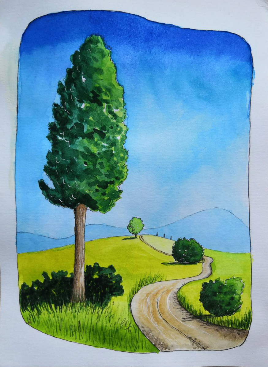 Первые полчаса - на то, чтобы собраться с духом и хоть что-то начать рисовать. Не пойму, что за эффект такой? Кажется, что стоит начать рисовать самостоятельно, непременно получится полный треш. И заранее жаль бумаги, красок и своего времени. Ну и в ходе рисования, оказывается, так много решений надо принимать. Перспектива, откуда свет падает, какой