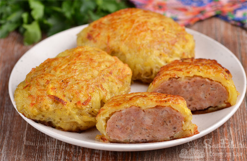 Чтобы сделать традиционное блюдо из фарша разнообразным и интересным, дополняю его картофелем. Но измельченный картофель не добавляю в фарш, а закрываю им фарш. Получаются необычные котлеты под картофельной шубой. К таким котлетам не надо готовить отдельно гарнир. Готовятся они очень просто и без добавления яиц. Котлеты в шубке быстро обжариваю на сковороде, а затем запекаю в духовке. Получается очень вкусно и оригинально.