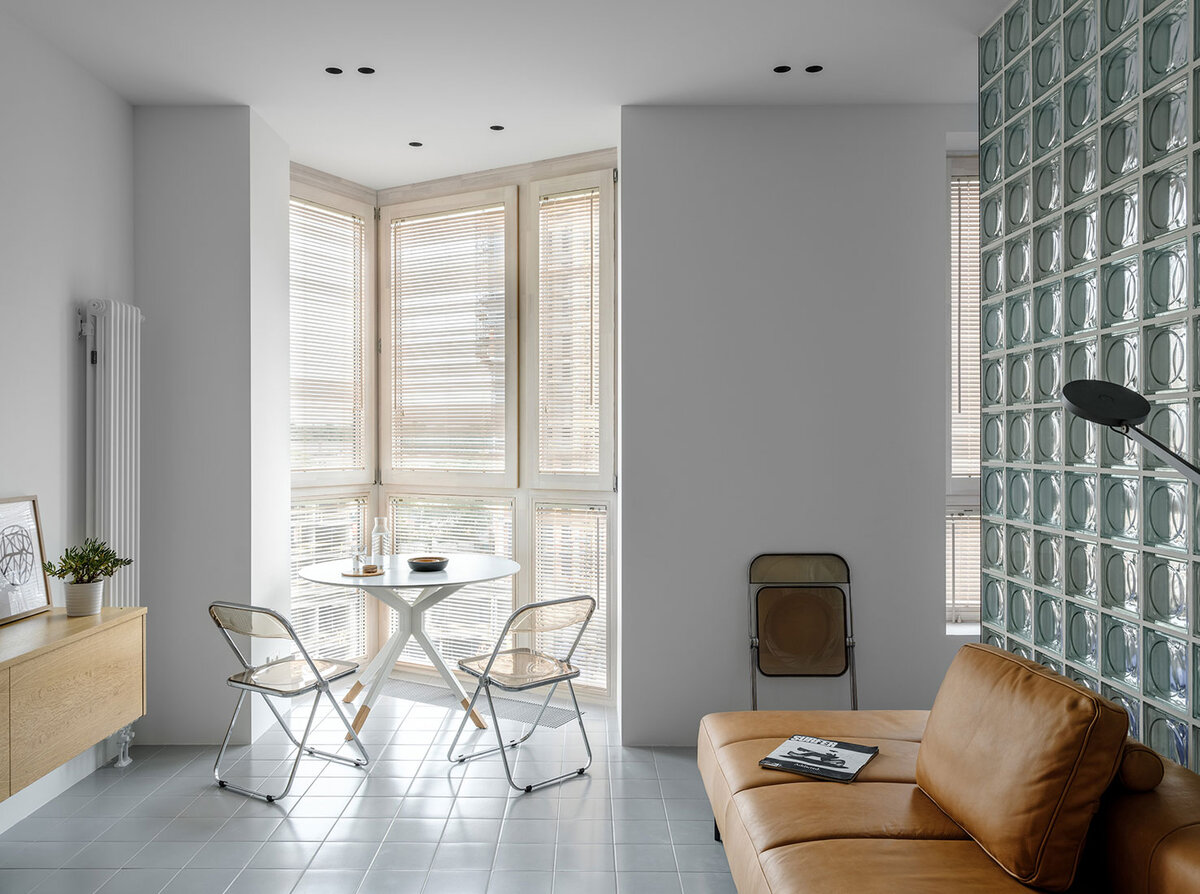 Маленькую квартиру архитекторы не стали дробить на изолированные комнаты, но между тем смогли разместить все необходимые функции. В одном помещении оборудовали кухню с лаконичными фасадами в цвет стен, гостиную и компактную столовую в эркере у окна, спальное место зонировали стеной из стеклоблоков.