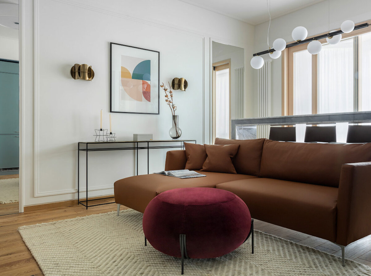 На стенах гостиной архитекторы применили зеркальные панно, которые расположили напротив дверных проемов, ведущих в прихожую и спальню. Этот прием помог визуально расширить пространство и добавить света.