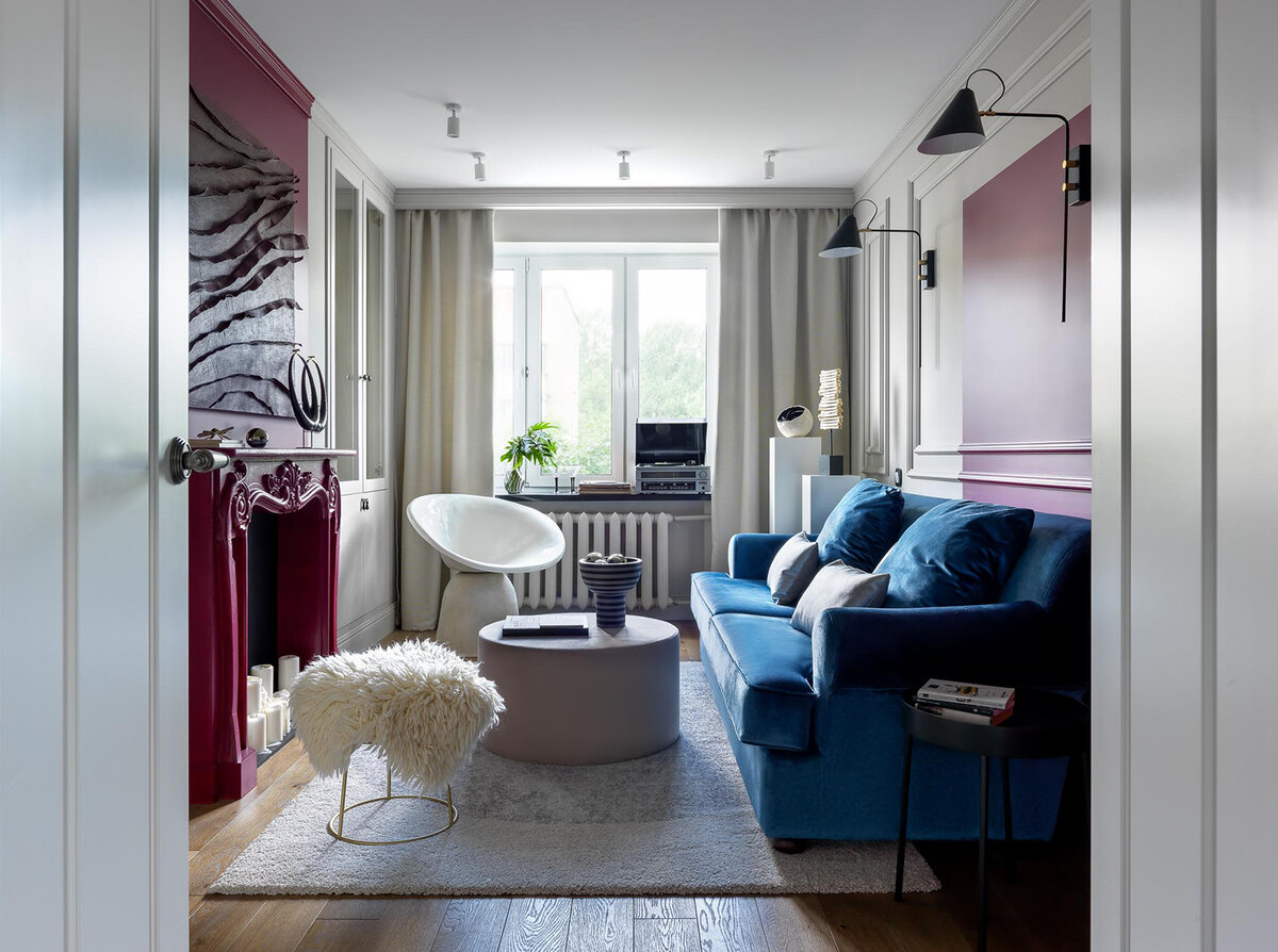 Маленькая квартира 45 кв. метров — классическая по виду и состоянию «хрущевка» со старыми коммуникациями, отделкой «прошлого века» и неудобной планировкой. Изначально заказчица хотела собственными силами справиться с ремонтом, но в ходе реализации поняла, что у пространства есть существенные недостатки и решила обратиться к профессионалам. Оформить интерьер пригласили Наталью Кореневу и Елену Жадан. Квартира расположена в московском доме 1965-го года постройки. Основной проблемой планировки стала чрезвычайно маленькая и узкая спальня. Ширина комнаты составляла всего 2,2 метра, но при этом необходимо было разместить в помещении полноценную двуспальную кровать, подойти к которой можно было бы с двух сторон. Перепланировку не меняли, но смогли переосмыслить и усовершенствовать. Стену в спальне выдвинули в сторону гостиной, в результате чего образовалась ниша под кровать. Со стороны гостиной выступ обыграли симметричными встроенными витринами и камином. Одним из ключевых пожеланий заказчи