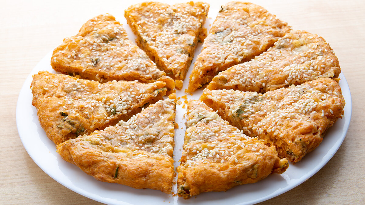 Нам понадобится: Мука - 300 гр Сметана - 350 гр Сыр - 200 гр Масло сливочное - 60 гр Разрыхлитель - 1 ч.л. Соль - 1 ч.л. Паприка - 2 ч.л. Хмели-сунели - 1 ч.л. Зелень петрушки Семечки кунжута Способ приготовления: 1. В просеянную муку добавляем соль, разрыхлитель, паприку, хмели-сунели и перемешиваем 2. Добавляем мелко нарезанную зелень и натертый на крупной терке сыр, перемешиваем 3. Теперь добавляем мягкое сливочное масло, перемешиваем 4. И в самом конце в тесто добавляем сметану, все хорошо перемешиваем до однородного состояния. 5. Делим тесто на 2 равные части 6. Противень застилаем бумагой для выпечки, выкладываем одну часть теста и руками формируем из нее лепешку 7. Смазываем лепешку сметаной и посыпаем кунжутом. Выпекаем в заранее разогретой духовке 20-25 минут при 180° ПРИЯТНОГО АППЕТИТА! Подробный рецепт приготовления можно посмотреть в видео: Еще больше вкусных, простых рецептов на каждый день или на праздничный стол вы найдете на нашем канале в YouTube: https://www.youtube