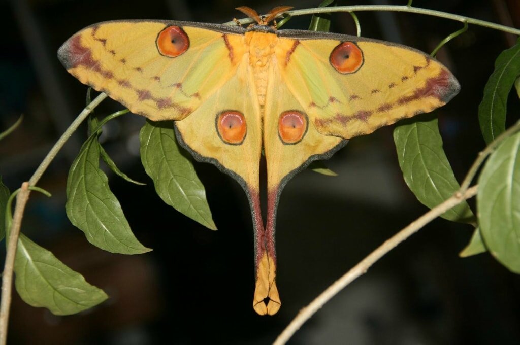 Павлиноглазка атлас впечатляет своими размерами: размах крыльев – до 25-28 см. Это ночная бабочка. Она коричневого, красного, желтого или розового цвета, на крыльях имеются прозрачные «окошки». Самка чуть крупнее самца. Гусеницы – зеленые, вырастают до 10 см.