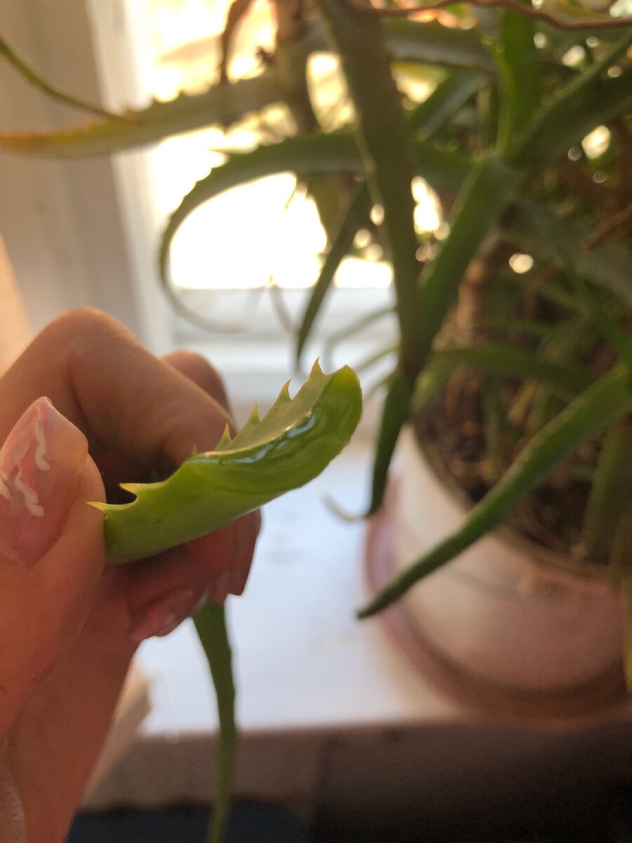 Это растение, обладает шикарными свойствами: Антибактериальное, заживляющее, противовоспалительное. Со сколькими проблемами организма он справляется, не перечесть. При насморке экстракт капают в нос, лечат бронхиальную астму, а так же, это хорошее средство для лечения множества кожных заболеваний, ожогов, ран и ссадин. А сколько витаминов он в себе содержит. Алоэ, так же очень часто используют в косметических средствах. Раньше, я покупала их в магазине и использовала от ушей до пяток. Но потом подумала, а почему бы не сделать это средство самой, ведь будет более натуральный продукт. Как его использовать? Я расскажу несколько идей как я пользуюсь полезными свойствами алоэ. И если у вас еще нет дома этого замечательного суккулента, рекомендую обзавестись. Обязательно! Перед применением проверьте нет ли у вас на него аллергии. Основной полезной частью алоэ является его сердцевина. Эдакое склизкое желе, которым заполнен лист. Я аккуратно отрезаю листик от куста и разрезаю вдоль на две час