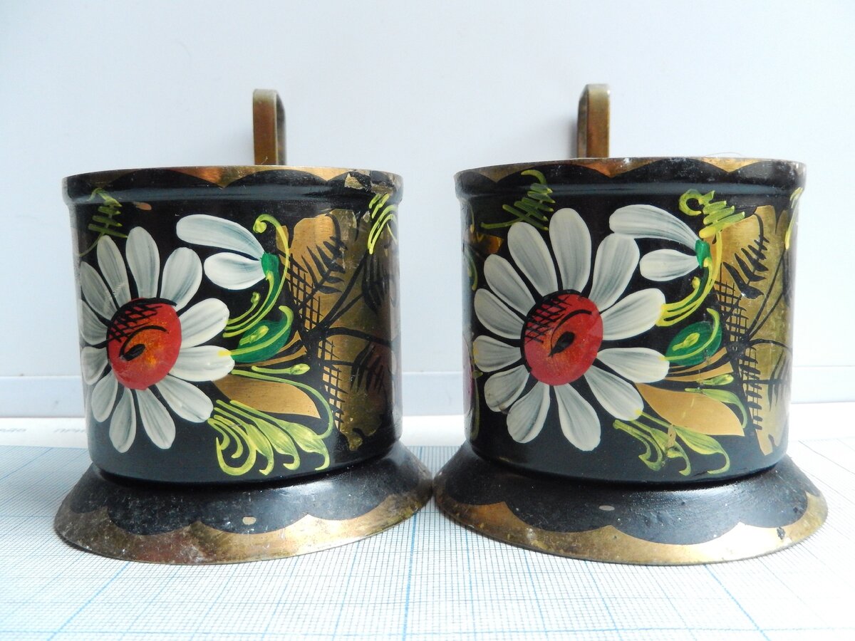 Подстаканники изготовлены из тяжелого металла, скорее всего из латуни. Довольно-таки красиво и ярко оформлены. По мне так оформление похоже на хохломскую роспись.