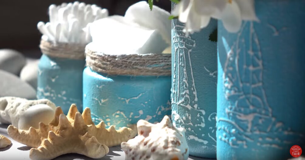 У нас получились вот такие чудесные баночки в морском стеле, которые можно использовать для декора ванной комнаты.