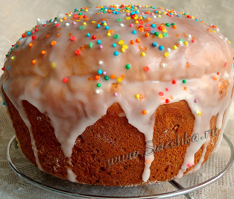 - 250 г сахарной пудры развести в горячей воде 3-4 ст.л., размешать и тут же покрыть кулич (смесь быстро застывает).