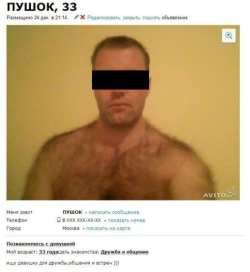 Судя по заявлению, некий рубаха-пареннь по прозвищу Пушок ищет девушку для дружбы, общения и встреч. Именно поэтому на фотографии он показал самую важную часть себя - обширные заросли.