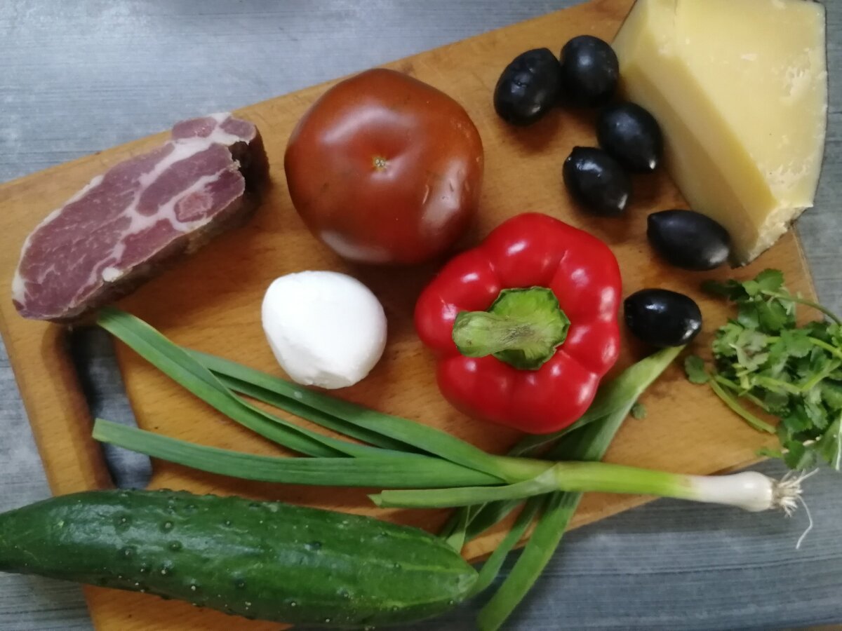 1. Овощи: помидор "черный принц", огурец, болгарский перец, маслины