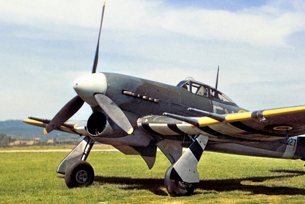 В воздухе самолет ведет себя как разжиревший соник, и этим все сказано. Хоть у нас под капотом и стоит Н-образный 24-цилиндровый Napier Sabre, развивающий 2000 лошадиных сил (что очень много, например на Эмиле стоит Damler-Benz 601, развивающий немногим менее 1000 лошадиных сил), но и сам самолет размером с пару спитфайров. Из этого сразу вытекает то, что мы просто великолепно чувствуем себя в пикировании.