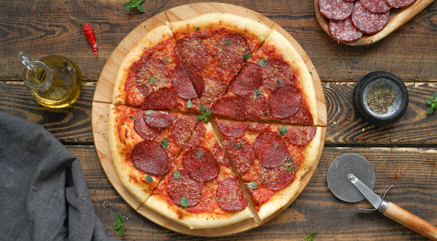 Пицца с копченой колбасой и сыром — блюдо незамысловатое, повседневное, но от этого ничуть не менее любимое. Во-первых, готовится оно элементарно (особенно, если вы всего один раз постараетесь — приготовите тесто с запасом и этот самый «запас» заморозите). Во-вторых, такой пицце будут счастливы и ваши близкие, и гости дома. А дети вообще придут в восторг! В-третьих, вам продоставляется возможность смело вносить изменения в состав начинки пиццы с копченой колбасой и сыром, добавляя в нее овощи, зелень или грибы: вкус выпечки от этого только выиграет. ИНГРЕДИЕНТЫ Для начинки: Для теста: ПОШАГОВЫЙ РЕЦЕПТ ПРИГОТОВЛЕНИЯ Шаг 1 Приготовьте тесто для пиццы с копченой колбасой и сыром. Сначала в маленькую мисочку насыпьте сухие дрожжи, залейте 3 ст. л. теплой воды и перемешайте. Оставьте на 15 минут, чтобы они активировались. Шаг 2 Муку просейте с солью в большую миску горкой. Сверху сделайте углубление, влейте разведенные в воде дрожжи и оставшуюся теплую воду. Затем вилкой или рукой начни