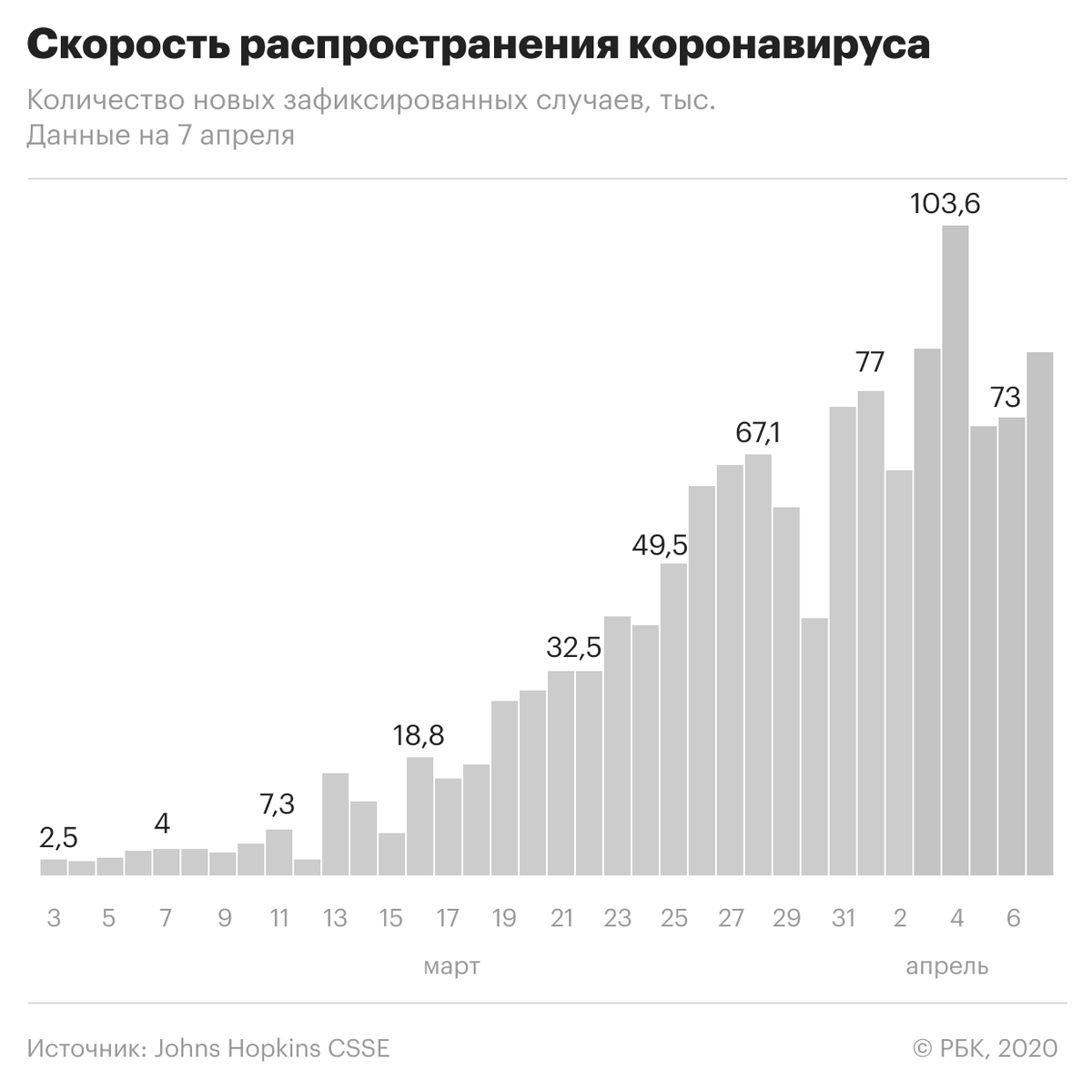 Общее количество россиян с положительным результатом тестов на COVID-19 превысило 8,6 тыс. человек, центр «Вектор» заявил о возможности начать испытание вакцины уже в мае. Погибшие и пострадавшие По данным Всемирной организации здравоохранения (ВОЗ), на вечер 6 апреля число зараженных новым коронавирусом в мире превысило 1,27 млн человек. Согласно актуальным данным Университета Джонса Хопкинса, всего заразилось уже свыше 1,430 млн человек, около 293 тыс. выздоровели. Лидером по числу подтвержденных случаев, по данным Университета Хопкинса, остаются США (398 тыс.). Испания находится на втором месте (141 тыс.), Италия — на третьем (135 тыс.), на четвертом — Франция (110 тыс.), Германия (107 тыс.) — на пятом. Китай, где началась пандемия, откатился на шестое место по числу случаев заражения (82 133, при этом 77,4 тыс. человек уже выздоровели). Всего в мире от коронавируса умерли, по данным Университета Джонса Хопкинса, 82 133 человека. Больше всего летальных исходов зафиксировано в Ит