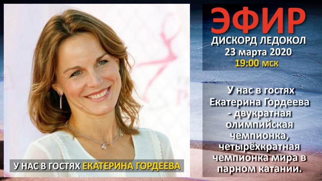 Ледокол (Марк): Всем добрый вечер! А у нас сегодня снова необычный эфир, беседа с интересным гостем. Встречайте — трехкратная чемпионка мира среди профессионалов, чемпионка СССР, чемпионка России, трехкратная чемпионка Европы, четырехкратная чемпионка мира, двукратная олимпийская чемпионка в парном катании Екатерина Гордеева. Екатерина Александровна, здравствуйте.