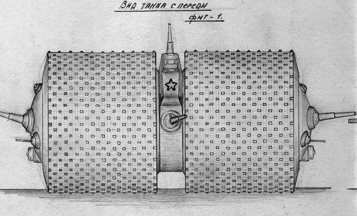 Схема танка виделась следующей: кабина, сваренная в виде цилиндра, вокруг которой реализована пара «колес» барабанного типа из бронестали с шипами-пирамидками. Барабаны независимы друг от друга, а с кабиной связаны рессорами-амортизаторами. Все вооружение, двигатель, баки для горючего и экипаж размещается внутри кабины.