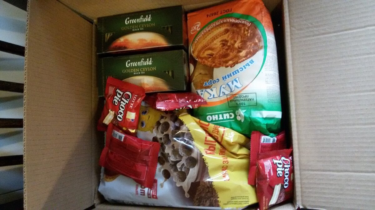 И так, что бы получить помощь от школ, нужно быть многодетной семьей. Если Ваши дети ходят в сад, то заявление на оказание помощи отправляют воспитатели групп. Сама помощь состоит из двух комплектов (коробок). Разбираем комплект № 1. Название «Комплектовочный лист № 1» Молоко 1 литр - 2 пакета Рыбные консервы (горбуша, сайра) 250 грамм - 3 банки Сухие завтраки 450 грамм - пакет Масло подсолнечное 1 литр Печенье с начинкой 61 грамм - 2 шт (положили 5 штук) Шоколадная плитка 85 грамм - 2 шт. Чай 25 пакетиков - 2 упаковки Мука 2 кг - 1 пакет